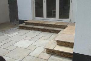 A yellow limestone patio with raised area at the rear for enjoying the evening sun.